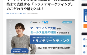 ご紹介詳細 この度、当社が提供する月額10万円から利用可能なセールス・マーケティングBPOサービス「トラノテマーケティング」が株式会社CONEが運営するBPOサービス比較サイト「b-pos」にインタビューを受けました。 […]
